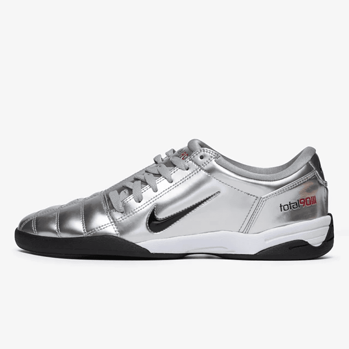 Conheça as Nike Total 90 3 SP, um modelo pensado para jogadores que buscam desempenho e estilo em campo. Com a sua cor metálica prateada e detalhes em preto, estes calçados combinam perfeitamente estética e funcionalidade.
